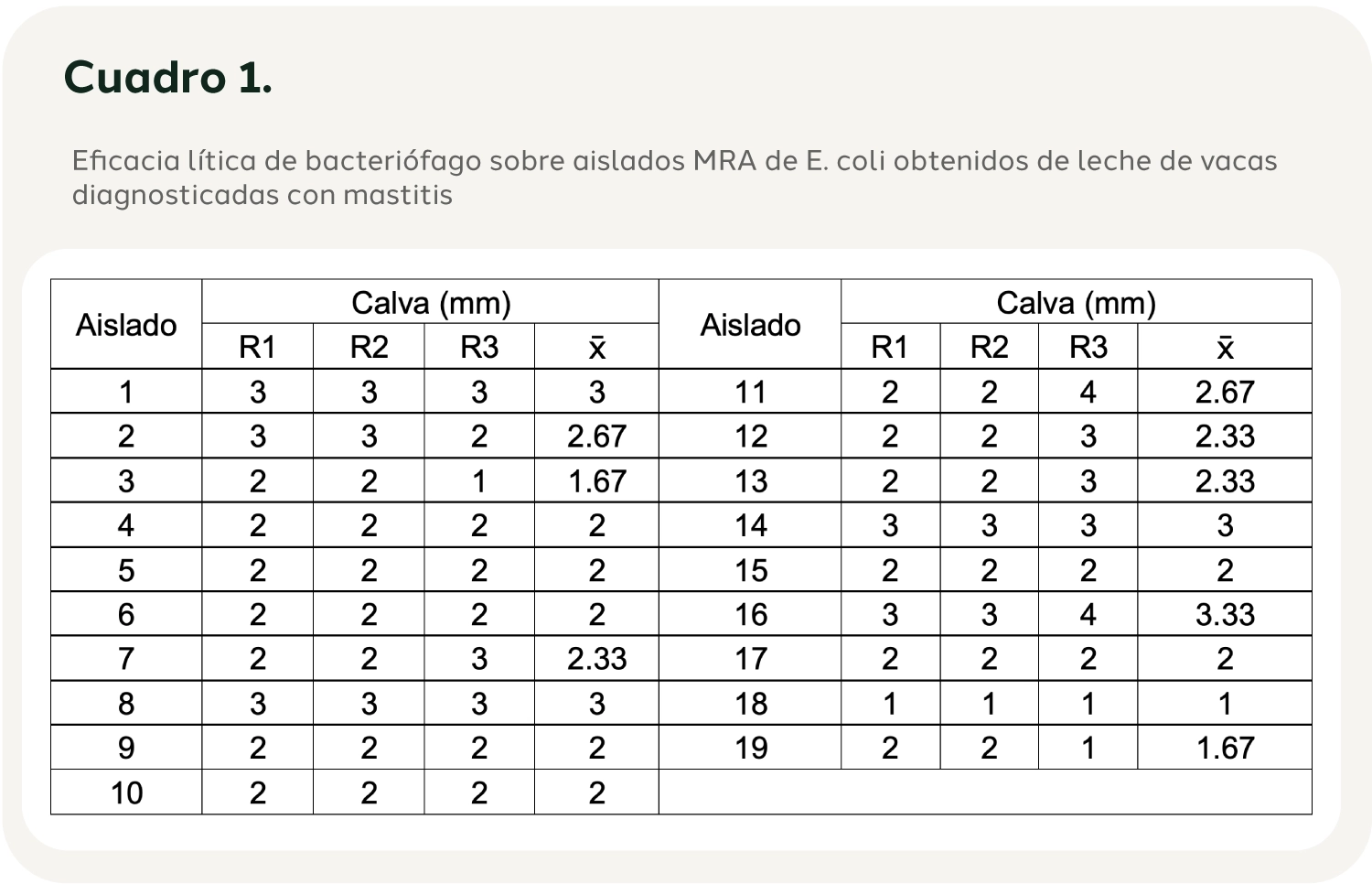 El bacteriófago de Escherichia coli tuvo una efectividad del 100% de lisis sobre los 19 aislados de leche de vacas diagnosticadas con mastitis, con un diámetro de calvas promedio de 2.26 mm (Cuadro 1).