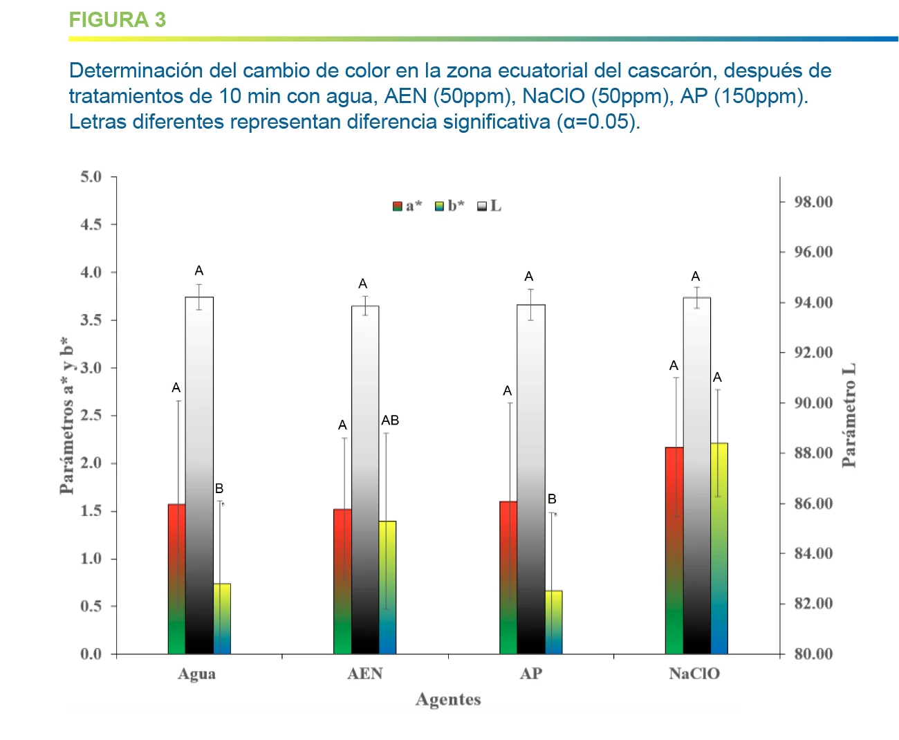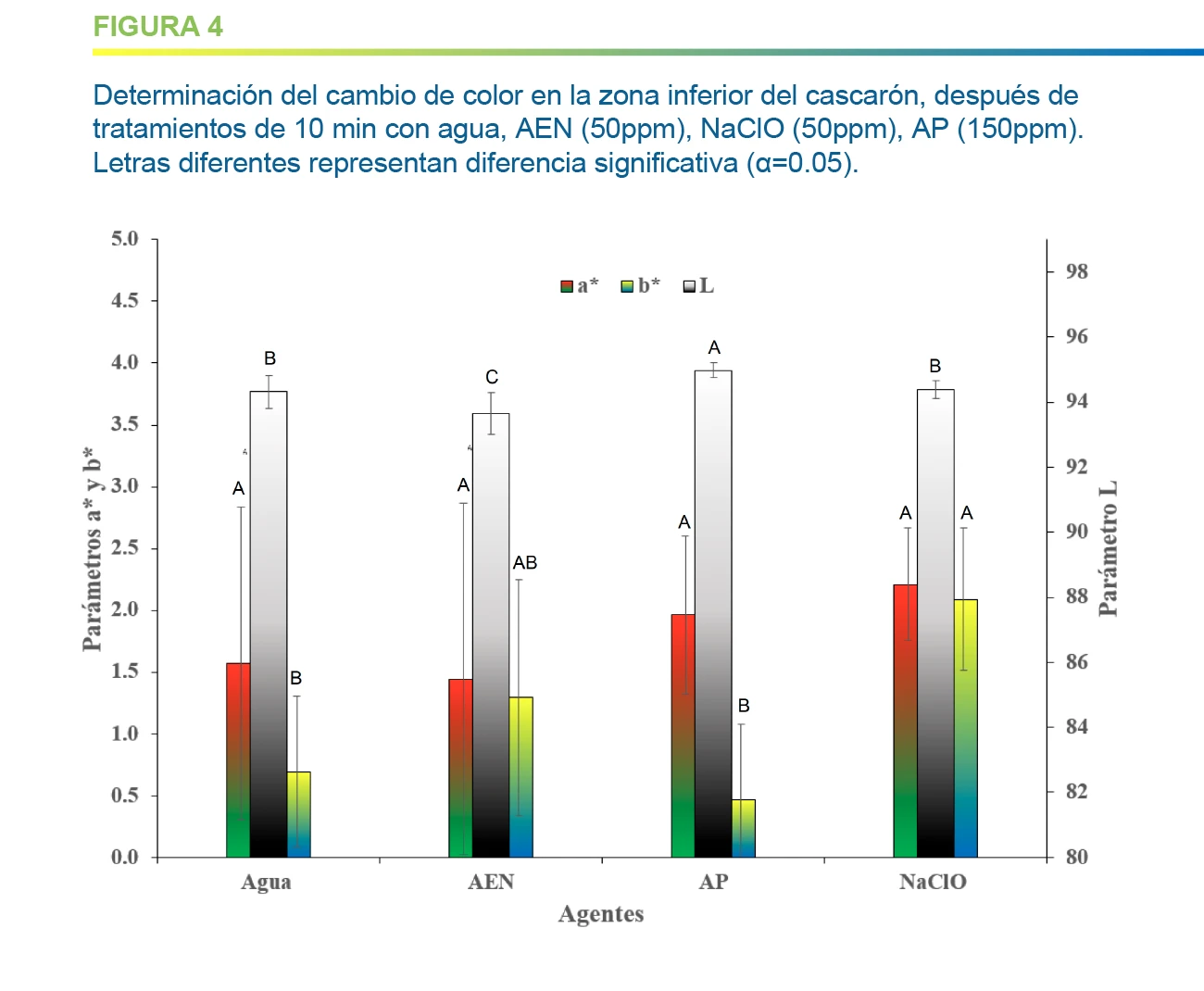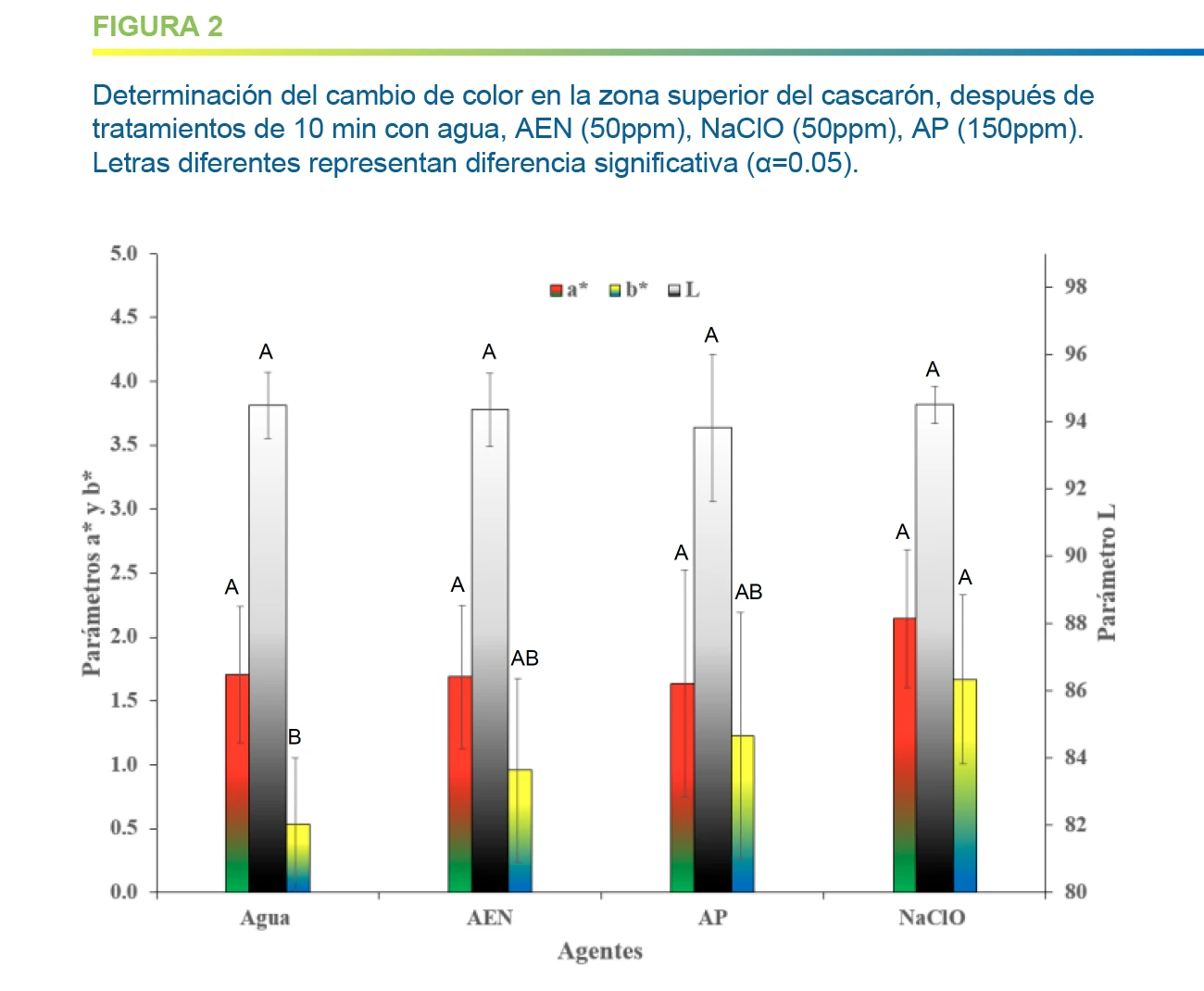 En cuanto a las mediciones de color en zona superior, y para los parámetros de color L* (luminosidad)y a* (tonalidad roja) no se aprecia diferencia estadísticamente significativa. El AEN a 50 ppm no presenta diferencia significativa con ninguno de los tratamientos en el cambio de coloración (ΔE). El NaClO (50ppm) presenta diferencia significativa con relación al control con agua en el parámetro b* que está relacionado con la escala en coloración amarilla, lo que implica que los huevos tratados con este agente presentan una coloración ligeramente más amarillenta.