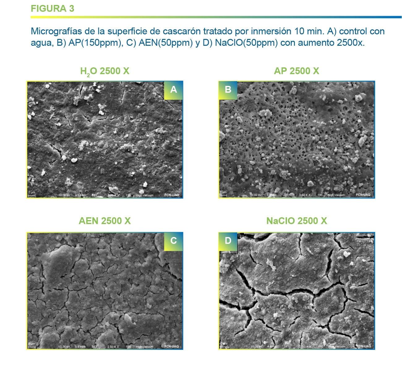 En este sentido, el uso de AEN podría implicar una ventaja ya que por un lado, tiene poder desinfectante similar al AP y al NaClO, pero estos dos agentes podrían facilitar el ingreso de agentes o sustancias contaminantes al interior del huevo y permitir asimismo un aumento en la transferencia de oxígeno e incluso la pérdida excesiva de agua (Bedoya, 2020). Medina-Gudiño et al. (2020) observaron que la cutícula del huevo de gallina muestra fisuras que relaciona con el aspecto del barro seco producido por la deshidratación de los grupos sulfhidrilo (SH) de las proteínas siendo una barrera muy importante para la calidad del huevo.