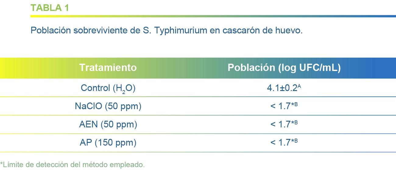 Se emplearon 45 huevos para este experimento con una unidad experimental de un huevo por cada tratamiento. Se empleó un tratamiento de AEN a 50 ppm, dos controles positivos de hipoclorito de sodio (NaClO) a 50 ppm, y ácido peracético (AP) a 150 ppm y un control negativo con agua para ver el efecto de arrastre. Se desinfectó con etanol al 70% /v/v) y se inoculó la superficie del cascarón de cada huevo con 1 mL del inóculo y se dejó un tiempo de adhesión de 10 min en campana de flujo laminar. Cada huevo inoculado, se sumergió en 90 mL de cada tratamiento durante 10 min y posteriormente, se sumergió y frotó durante 2 min en 90 mL de agua peptonada estéril para la recuperar las bacterias tratadas sobrevivientes. Se realizaron diluciones decimales seriadas e inocularon cajas Petri con agar soya tripticaseína (AST) mediante el método Miles-Misra y se incubaron a 37 °C durante 24 h. Se realizaron tres réplicas experimentales.