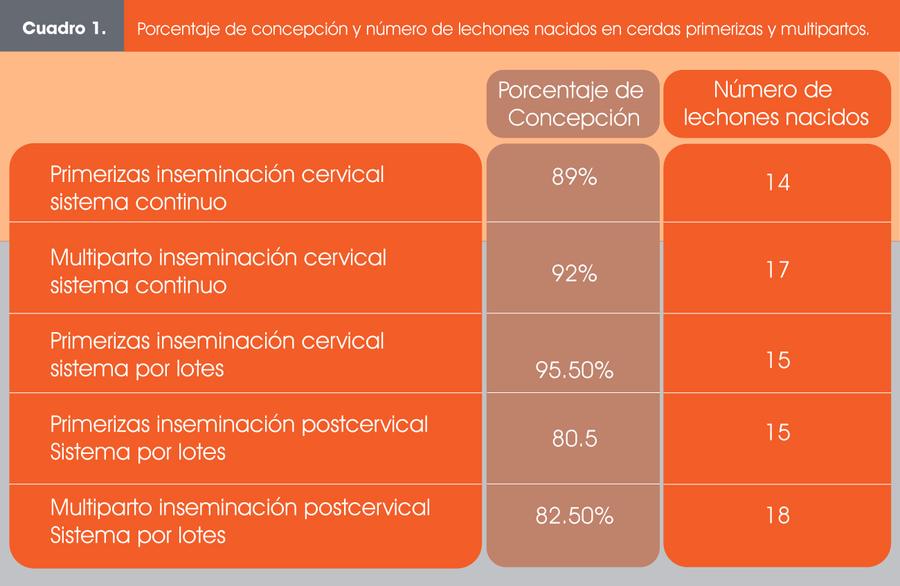 En el sistema por lotes los porcentajes de concepción en cerdas multiparto fue del 79% al 86% y de 18 lechones nacidos vivos sin embargo muchas camadas presentaron bajos pesos al nacimiento y marranas con baja producción de leche, esto se atribuye al mal manejo del semen que disminuye su viabilidad, a una falta de estimulación del verraco ya solo se usa para la detección del calor y no está presente cuando se realiza la inseminación de las cerdas, y a una falta de estimulación de los inseminadores hacia las cerdas, así como a una mala gestión de la alimentación post inseminación y en gestación, sin embargo en la unidad de desarrollo de primerizas se observaron dos comportamientos similares a los anteriores, por un lado se observó que las primerizas al ser inseminadas mediante la técnica cervical y en presencia del macho y con el transporte de no más de 50 dosis de semen y el cuidado de su temperatura así como de una adecuada estimulación por parte del inseminador hacia las cerdas se obtuvieron porcentajes de concepción del 93% hasta el 98% y un número de 14 a 16 lechones nacidos vivos, por otro lado al usar la técnica postcervical en cerdas primerizas sin la presencia del macho y sin la estimulación de los inseminadores se obtuvieron porcentajes del 78% al 83% de concepción y un número de 14 a 17 lechones nacidos vivos.
