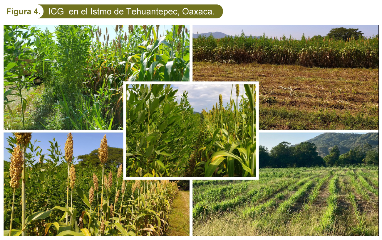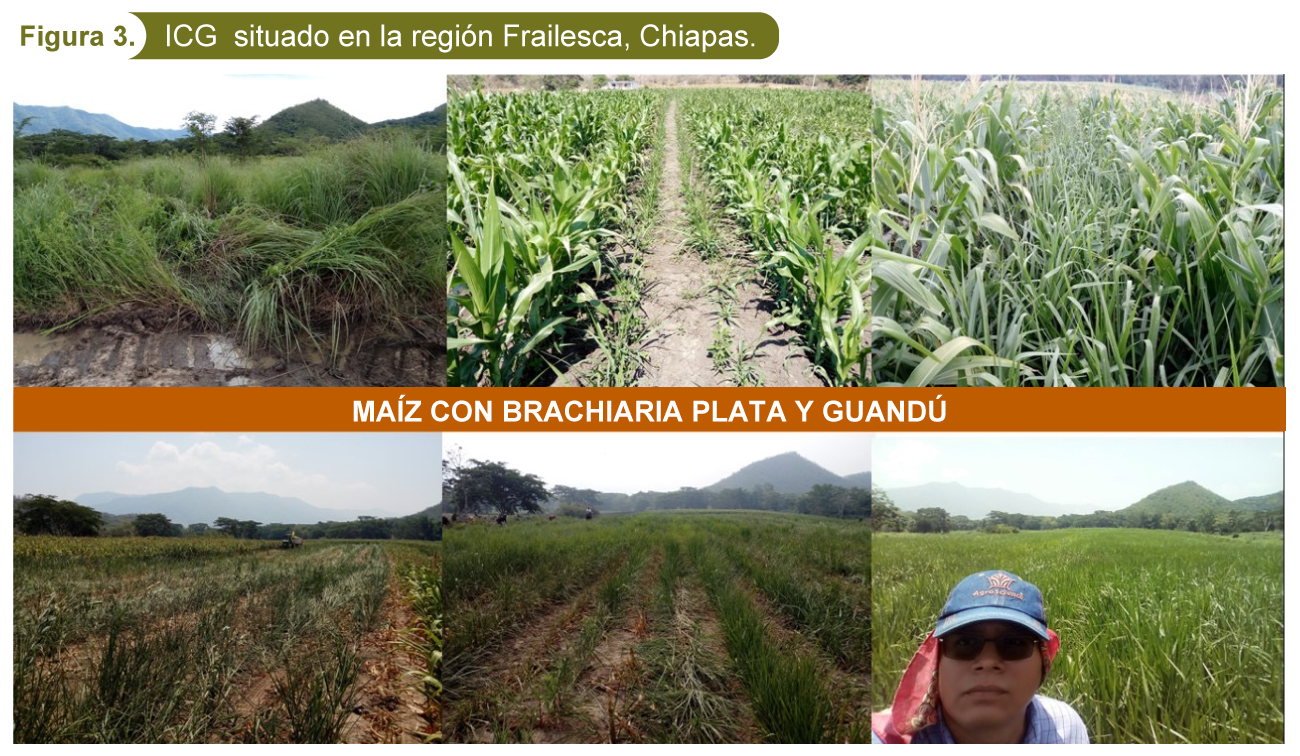 Se muestran algunos cultivos desarrollados en la región de la frailesca, Chiapas (ver figura3), donde se aprecia un pastizal degradado con alta incidencia de maleza, plagas y pobre calidad nutritiva, se realizó el establecimiento simultaneo de 3 cultivos (Maíz+Guandú+Brachiaria brizantha cv. Piata), se cosecho para su conservación vía ensilaje, a los 15 días se ingreso animales para su pastoreo y posteriormente una pradera establecida con excelente vigor y optima calidad nutritiva.