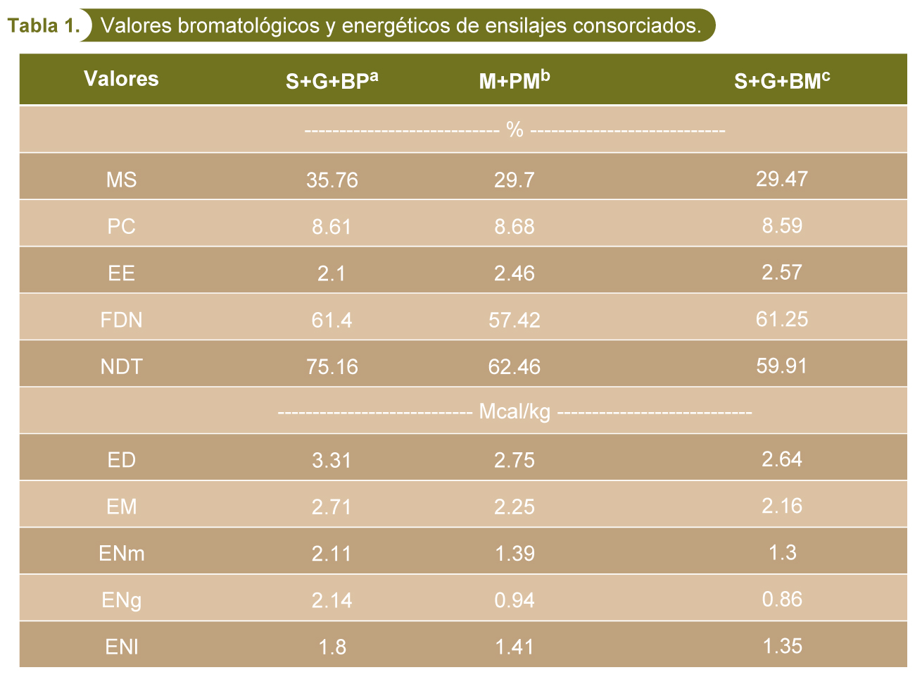 materia seca (MS), proteína cruda (PC), extracto etéreo (EE), fibra detergente neutro (FDN), nutrientes digestibles totales (NDT), energía digestible (ED), energía metabolizable (EM), energía neta de mantenimiento (ENm), energía neta de ganancia (ENg), energía neta de lactancia (ENl)
