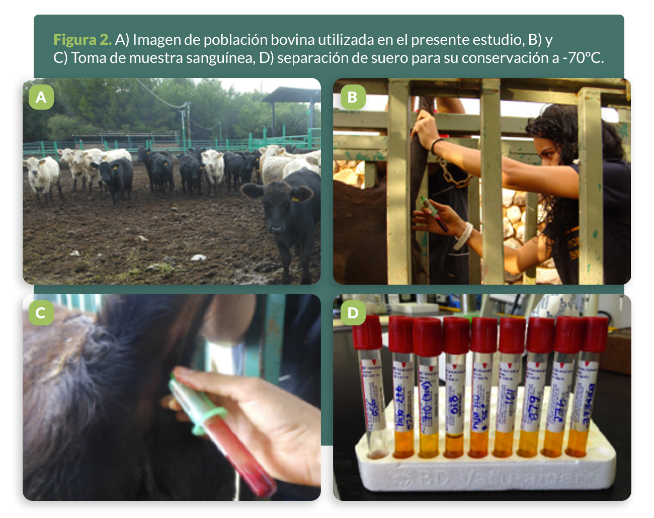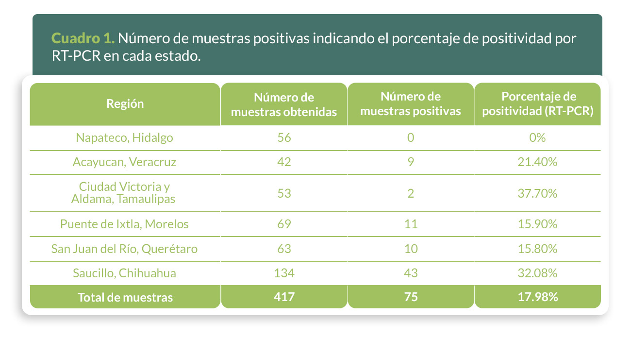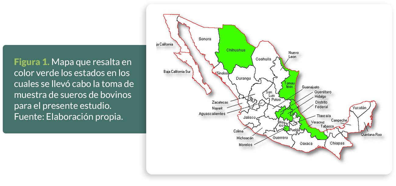 Se procesaron un total de 417 sueros de bovinos, hembras y machos, involucrados en producción de leche, carne y doble propósito provenientes de seis regiones de México que incluyen: Napateco, Hidalgo; Acayucan, Veracruz; Ciudad Victoria y Aldama, Tamaulipas; Puente de Ixtla, Morelos; San Juan del Río, Querétaro y Saucillo, Chihuahua (Figura 1).