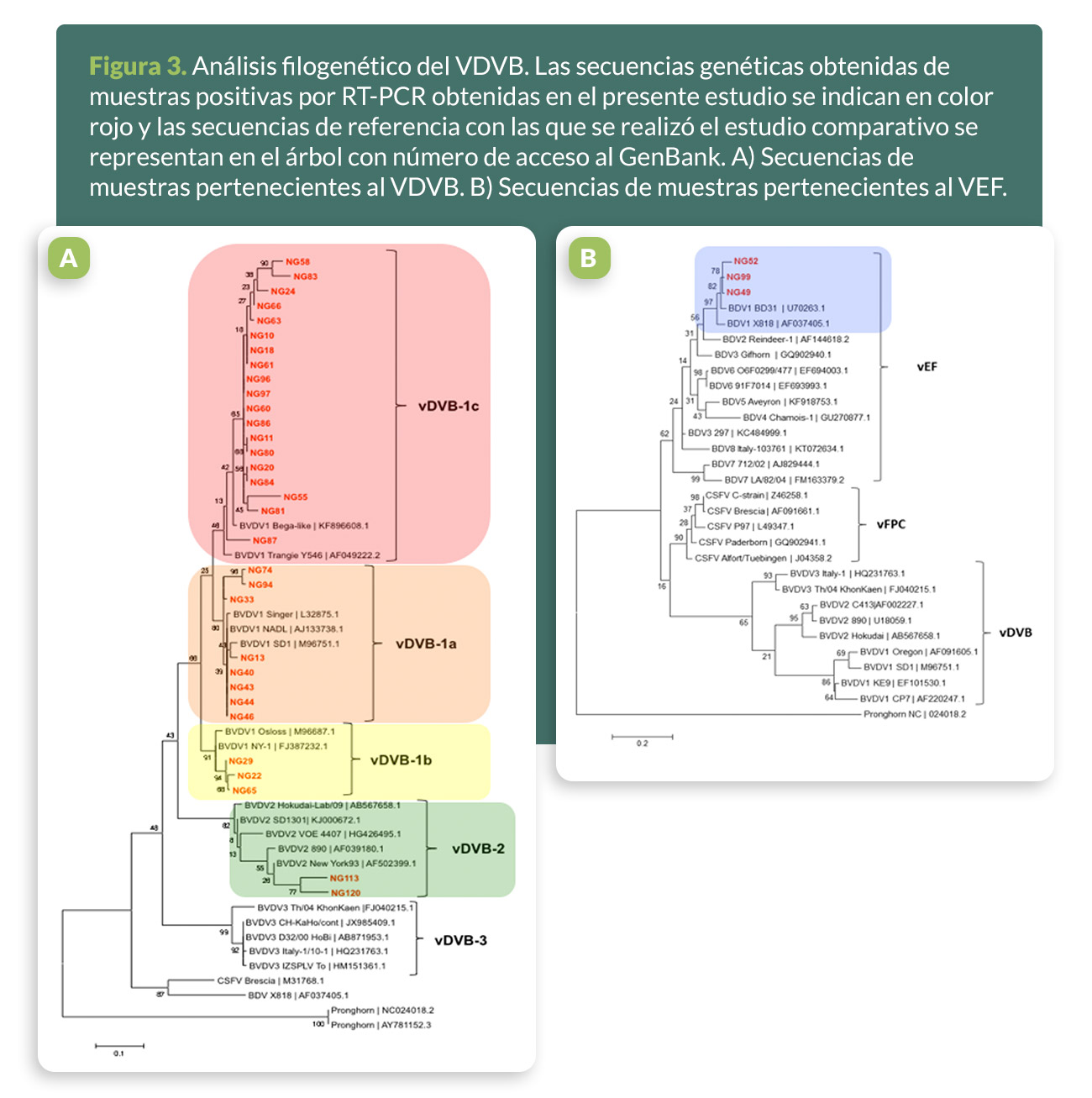 El árbol filogenético muestra los clados correspondientes al VDVB-1, VDVB-2, HoBi-like, VEF, VFPC y virus de Pronghorn. Aproximadamente, el 91.17% de muestras positivas obtenidas en el presente trabajo se clasificaron dentro de los subgenotipos VDVB-1a, VDVB-1b y VDVB-1c. Una menor proporción de muestras, el 2.94%, se agruparon en el subgenotipo del VDVB-2ª (Figura 3 A). Ninguna de las secuencias se caracterizó como tipo HoBi-like. Adicionalmente, el análisis mostró que 3 de las muestras de suero de bovino, identificadas como NG49, NG52 y NG99, se clasificaron como VEF (Figura 3 B).