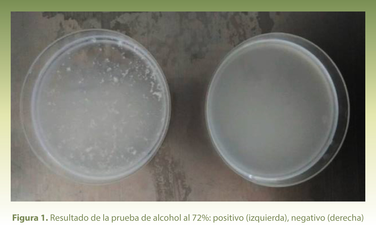 - Prueba de alcohol al 72%: indica la estabilidad de la caseína que es la principal proteína de la leche, esta se encuentra en forma de micelas por un estado de equilibrio dado por un pH de 6.8 y por la presencia de iones de calcio, si dicho equilibrio se rompe, las micelas se precipitan. Para realizar esta prueba se agrega alcohol al 72% a la muestra de leche con la finalidad de desequilibrar el medio promoviendo la floculación; reacciones positivas provocan precipitación de las proteínas dando grumos como resultado, por el contrario, reacciones negativas no presentarán evidencia de grumos (Figura 1).