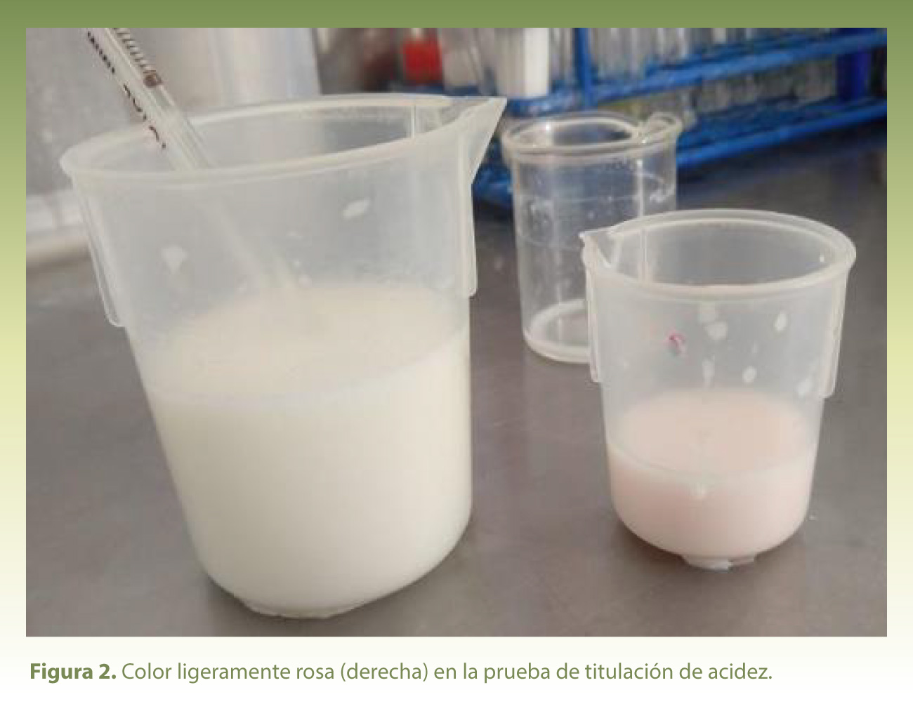 - Titulación de acidez: la leche contiene dos tipos de acidez: la acidez aparente, otorgada por los componentes propios de la leche (fosfatos, citratos, caseínas, lactoalbúminas, minerales y ácidos orgánicos), y la acidez titulable, generada por el desdoblamiento de la lactosa y otras fermentaciones que dan como consecuencia, principalmente, el ácido láctico. Esta prueba es un método colorimétrico que detecta la concentración de ácidos en la leche con la finalidad de asegurar que no rebase el límite máximo permitido. Se realiza adicionando gotas de fenolftaleína al 1% a la muestra, titulando con una bureta graduada que contiene hidróxido de sodio 0.1 N, hasta que la leche se torne de un color ligeramente rosa (Figura 2).