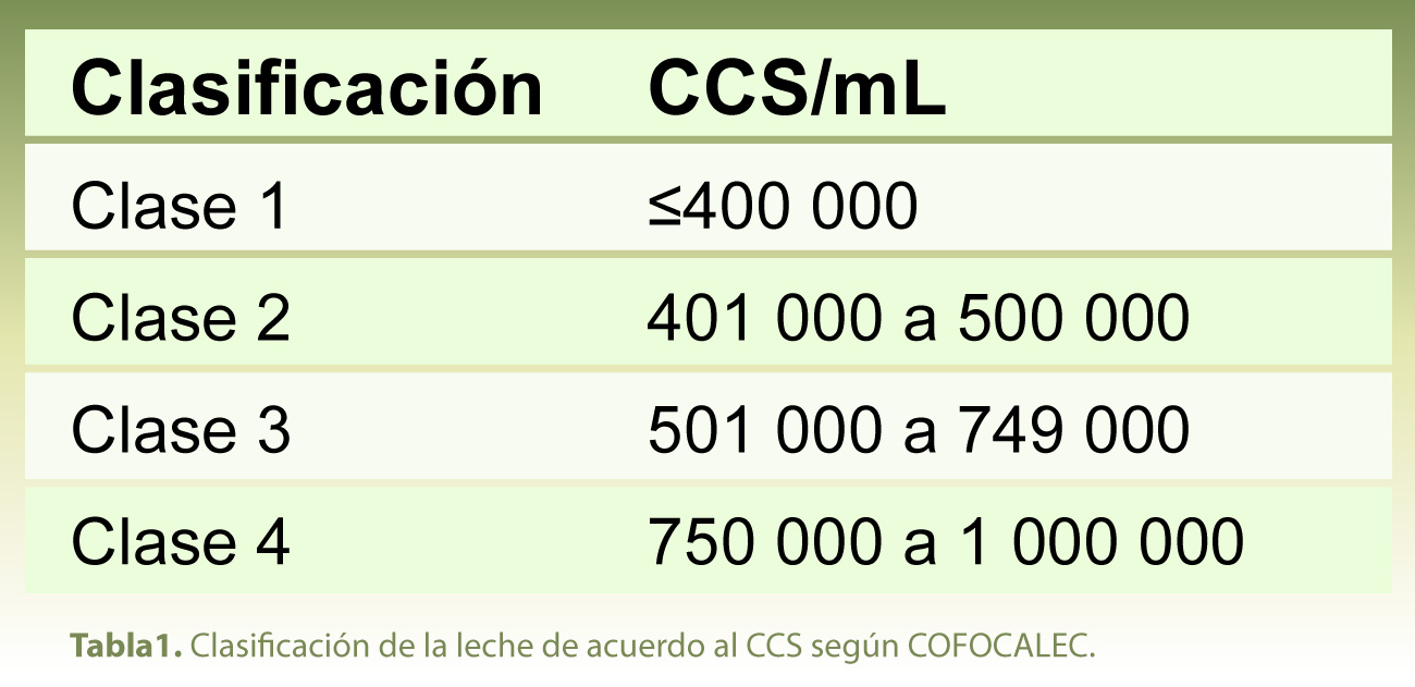 - Conteo de células somáticas (CCS): la presencia de células somáticas en la leche es normal, ya que al ser células de defensa del cuerpo del animal no pueden estar ausentes, sin embargo, entre menos cantidad se encuentren mejora la calidad de la leche. Un CCS alto está relacionado con una disminución de componentes lácteos (azúcares, grasas, proteínas) y un aumento en enzimas que atacan a estos mismos componentes, traduciéndose en una menor vida de la leche (Nelson-Philpot, W; Nickerson-C, 2000). Existen varios métodos para determinar el CCS, como tiras colorimétricas o contadores electrónicos. Los resultados de CCS/mL se clasifican de acuerdo a la NMX-F-700-COFOCALEC-2004 de la siguiente manera (Tabla 1): En la mayoría de centros de acopio a partir de la clase 4 no hay incentivos.