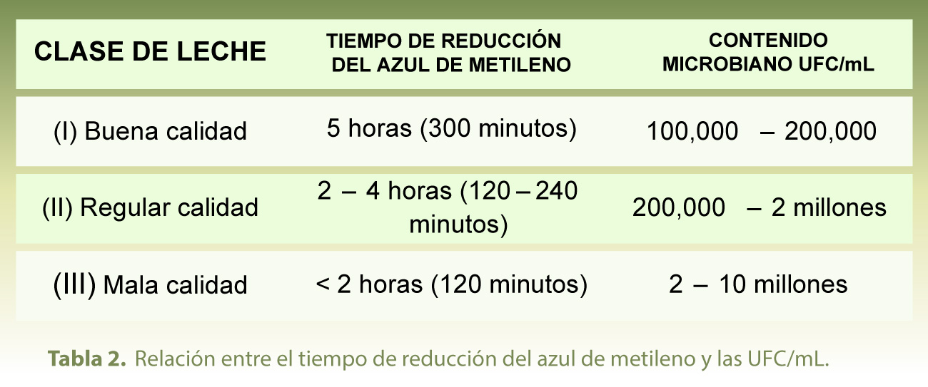 - Reducción de azul de metileno: también denominada prueba de la reductasa bacteriana, es un método indirecto para estimar el número aproximado de gérmenes en leche, se basa en la reducción del azul de metileno, un colorante que en su estado oxidado es de color azul y que en su estado reducido es incoloro; el tiempo que tarda en reducirse está condicionado al metabolismo y multiplicación bacteriana, al consumir oxígeno y producir enzimas reductasas, lo anterior modifica el potencial oxido-reducción del medio, por lo tanto en una leche poco higiénica (con alto contenido de bacterias) al azul de metileno le tomará menos tiempo tornarse incoloro y viceversa. En la Tabla 2 se explica la relación entre el tiempo que tarda en reducirse el azul de metileno y la cantidad aproximada de unidades formadoras de colonias (UFC) en leche (CANILEC, 2011; SEDESOL, 2017).