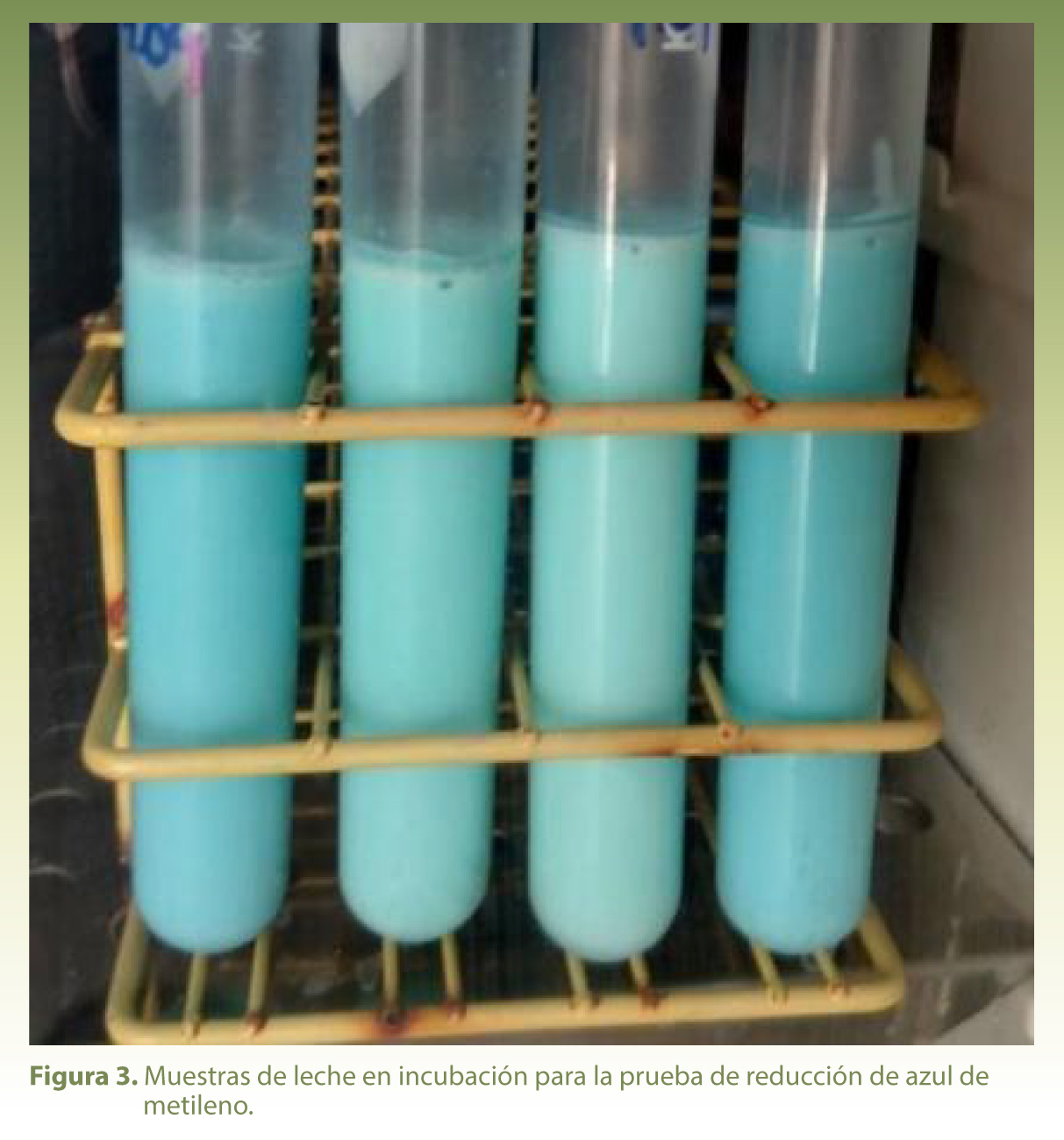 La prueba se realiza mezclando 0.5 mL de azul de metileno en 20 mL de leche y se incuba de 37 °C a 39 °C el tiempo que sea necesario para observar la reducción (Figura 3). Es importante agitar suavemente cada 15 minutos para evitar la formación de una capa de grasa en la parte superior, ya que pueden quedar bacterias atrapadas incrementando el tiempo de la prueba.