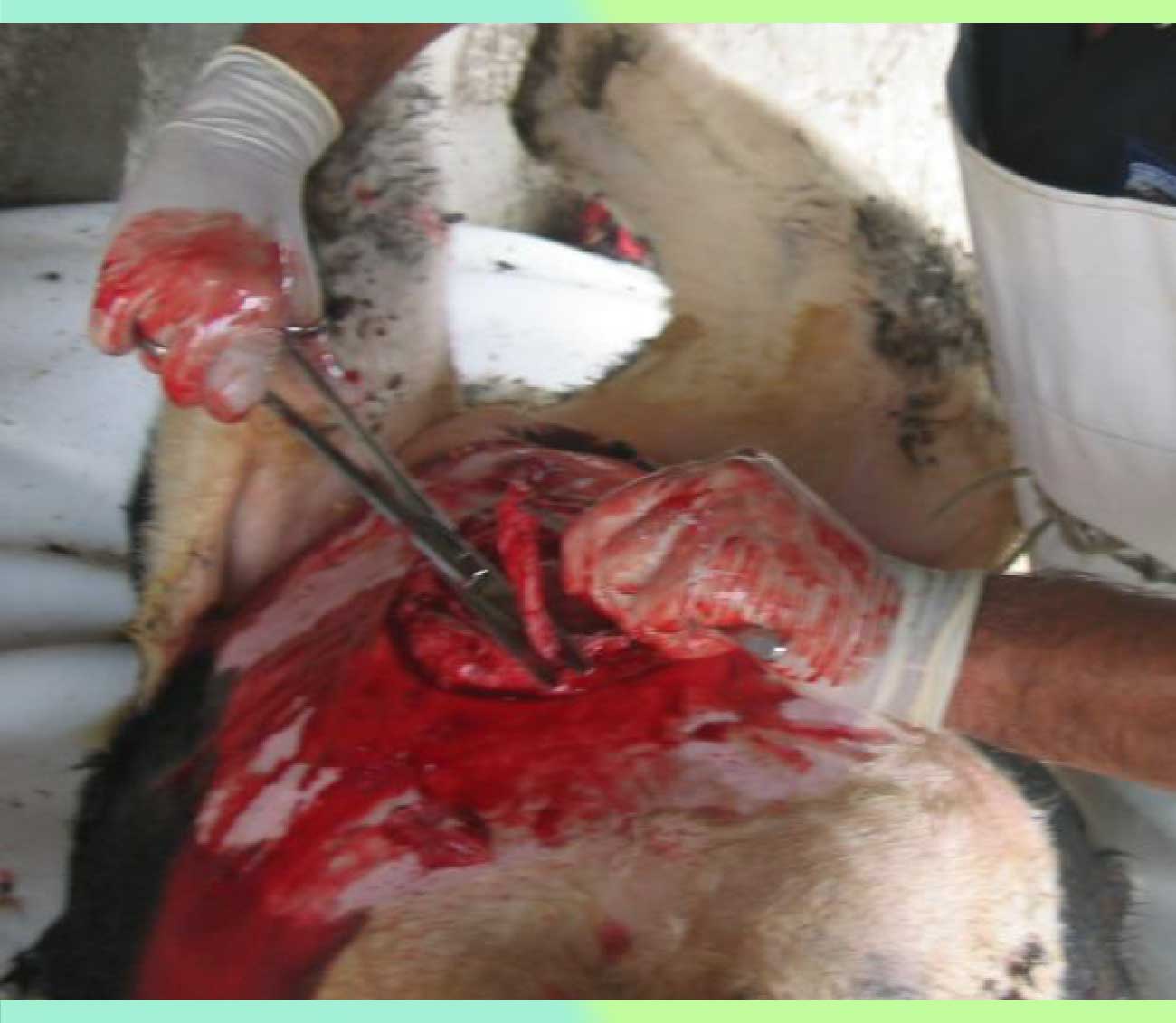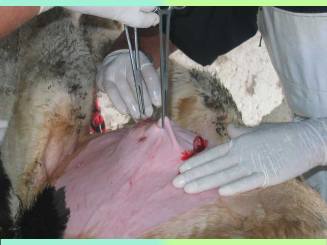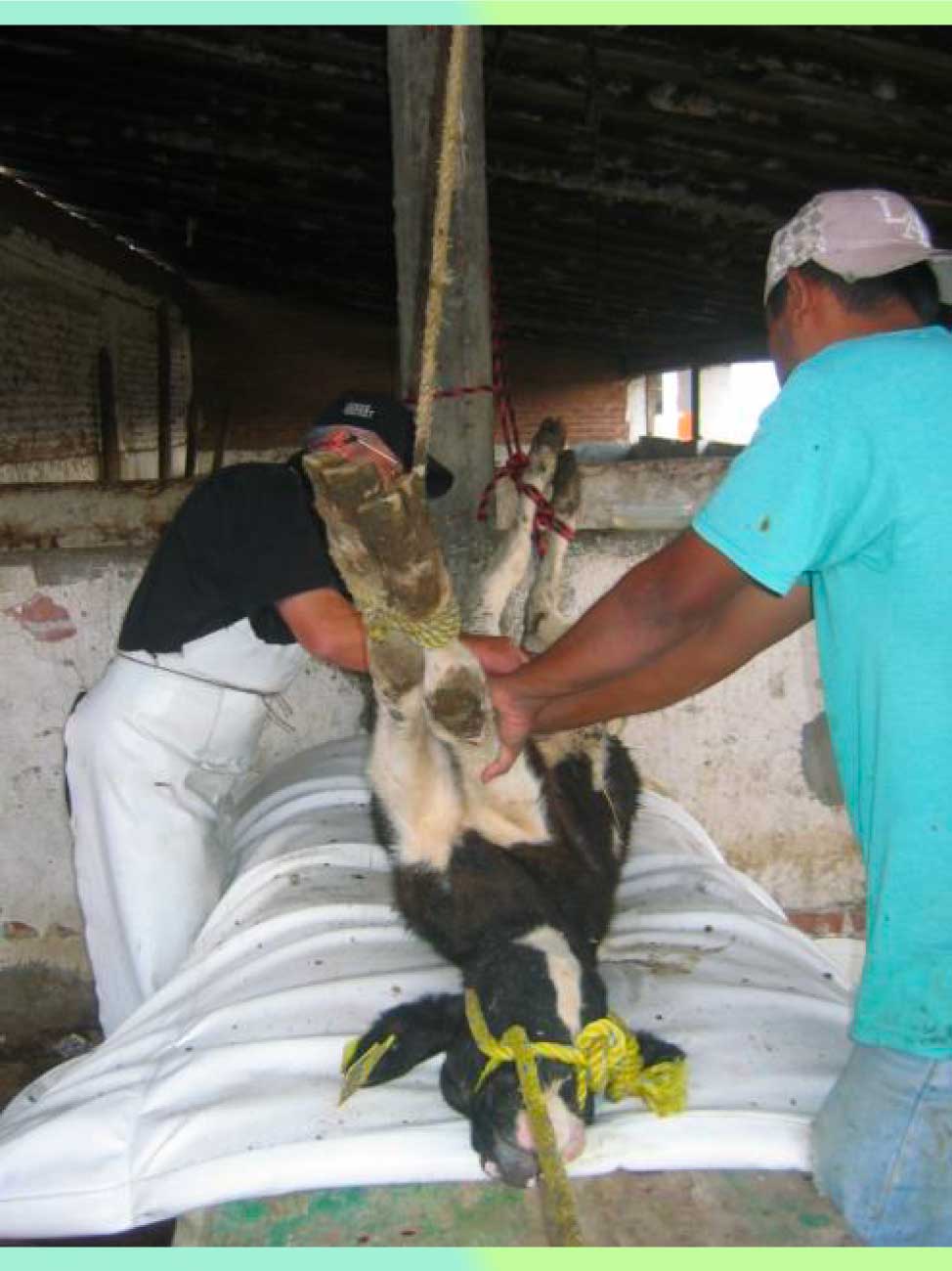 Una vez postrado se le sujetan tanto miembros anteriores como miembros posteriores con cuerdas, con el propósito de reducir el riesgo de un movimiento brusco por parte del animal. Se coloca a la becerra sobre una superficie limpia y mullida (colchón plástico).