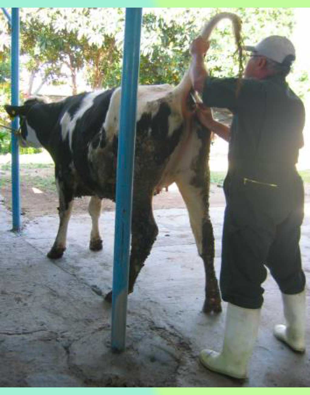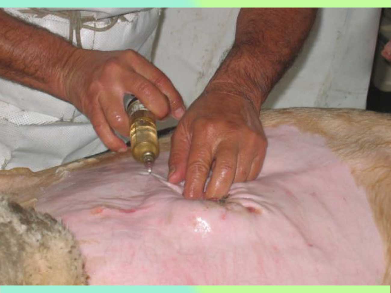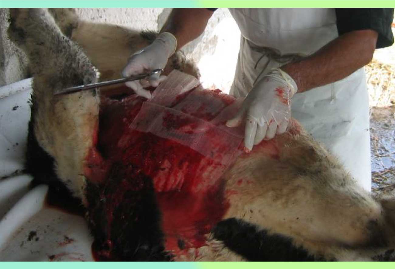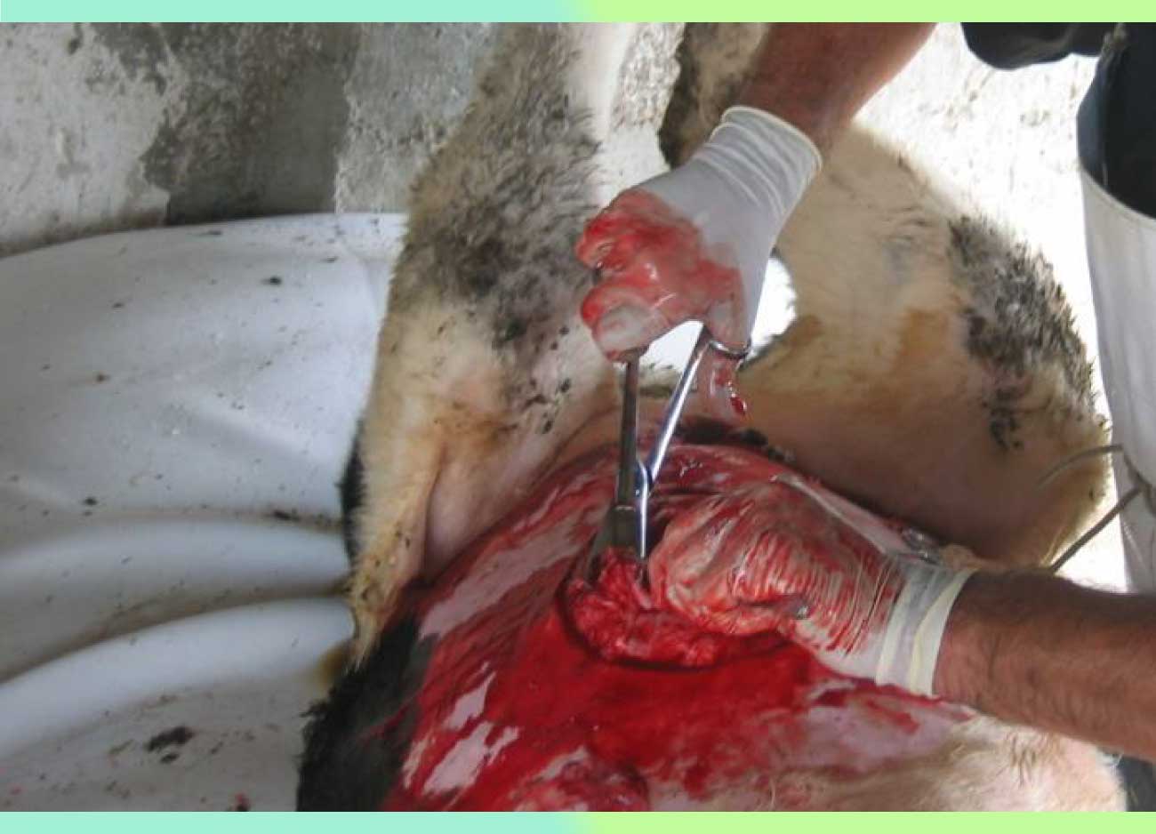 Una vez postrado se le sujetan tanto miembros anteriores como miembros posteriores con cuerdas, con el propósito de reducir el riesgo de un movimiento brusco por parte del animal. Se coloca a la becerra sobre una superficie limpia y mullida (colchón plástico).