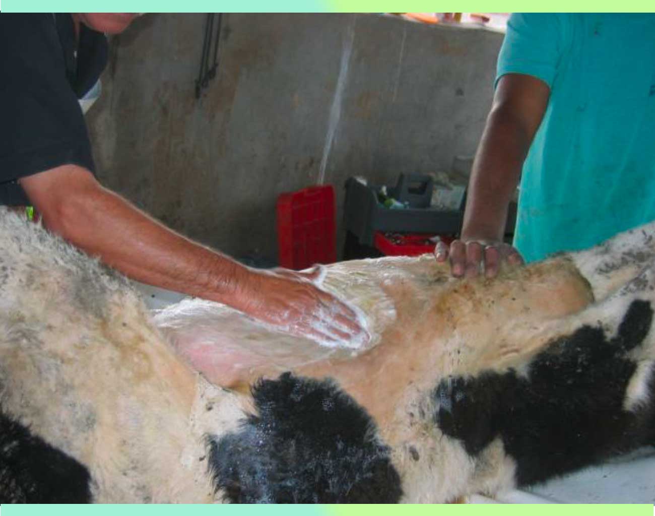 Una vez que la becerra ya se encuentra en plano quirúrgico y en posición de decúbito dorsal, se procede a lavar enérgicamente con agua y jabón y a rasurar el área en donde se va a realizar la intervención quirúrgica.