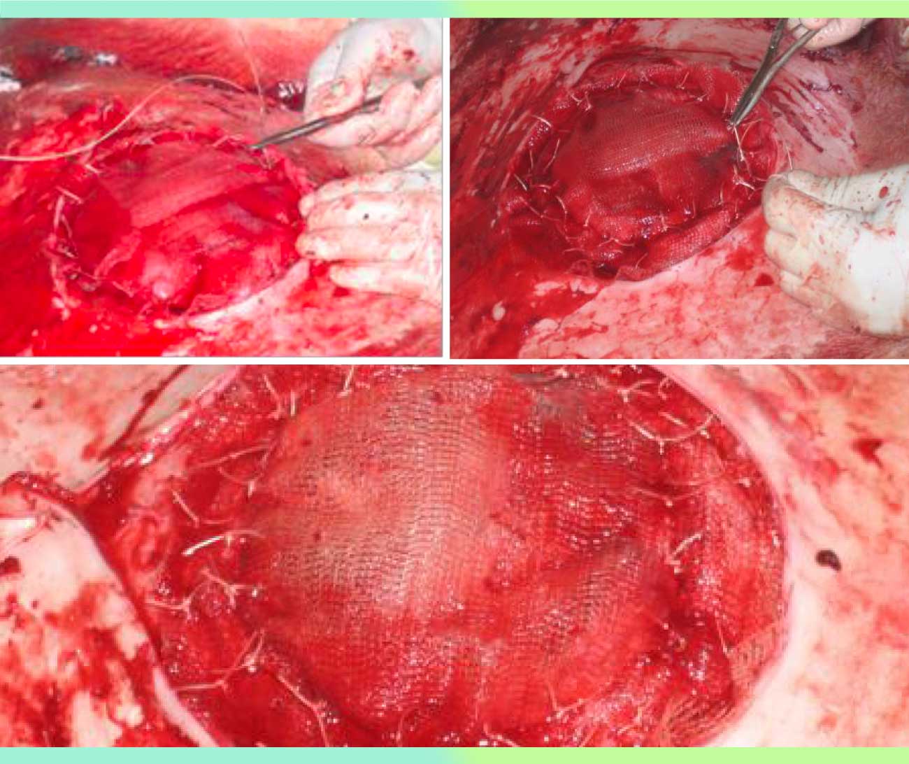 Como siguiente paso se sitúa la malla de polipropileno sobre el área quirúrgica para determinar el tamaño que se utilizará para reducir la hernia. Se corta la malla abarcando la herida completamente y sobrepasando sus bordes 2 cm, se separa la piel y el músculo contiguos al anillo herniario, introduciendo la malla entre estos dos tejidos. A continuación se fija la malla con Catgut crómico o Braunamid de calibre #2 o #3, iniciando la fijación con cuatro puntos separados ubicados en los cuatro puntos cardinales, cada uno de ellos.
