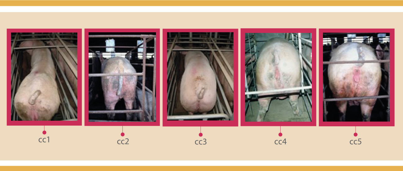 Condición corporal 2 (cc2): cerda flaca, la pelvis y los huesos de la columna vertebral son visibles y se aprecian fácilmente a la palpación.