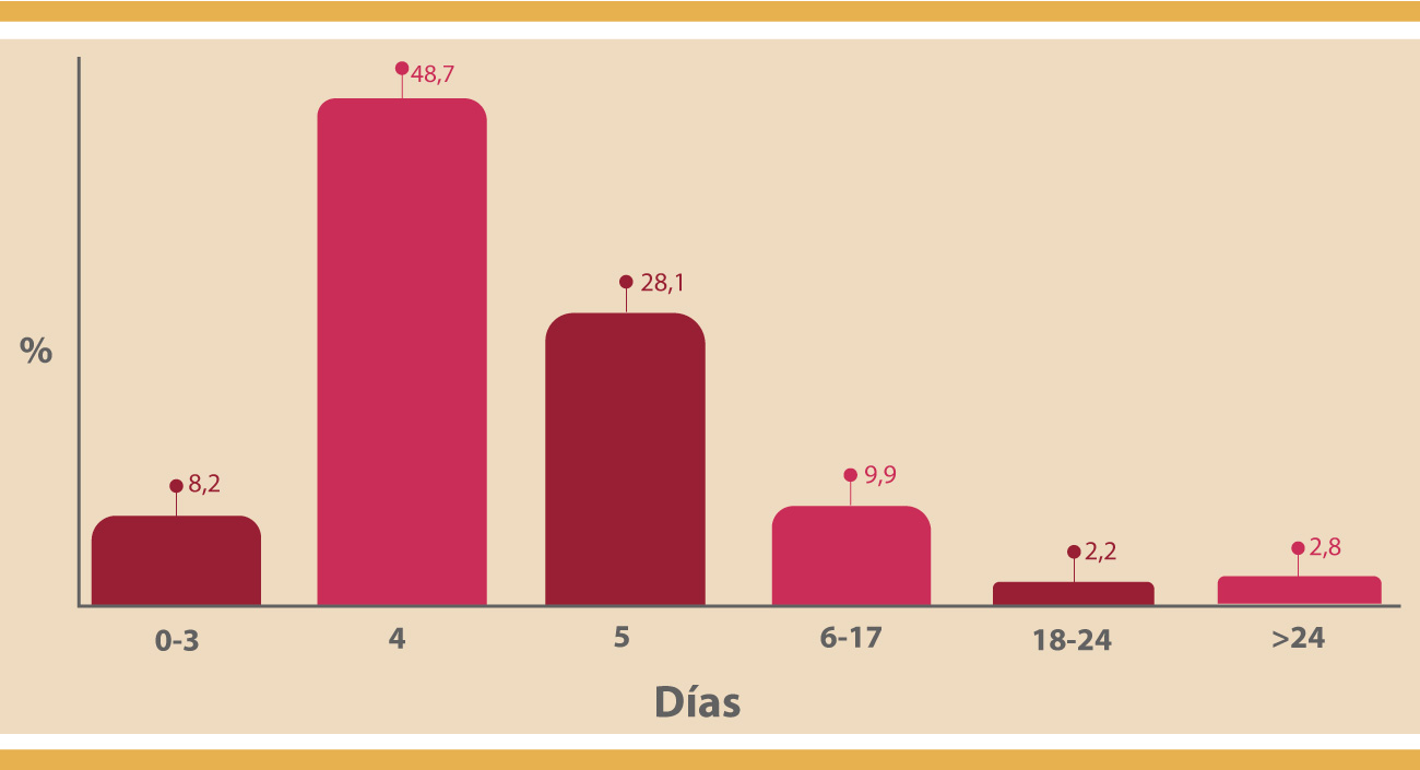 Claramente se observa que 4 y 5 días son los IDC más comunes, con un 48,75 % y un 28,1 % respectivamente. En la siguiente tabla (tabla 1), se muestran los resultados postcubrición de estos dos grupos de cerdas en cuanto a tasa de partos (TP) y prolificidad expresada como nacidos totales (NT) del siguiente parto. Además, también se muestra la composición de cada grupo: su edad media expresada en número de partos medio y el porcentaje de cerdas primerizas contenidas en cada grupo.