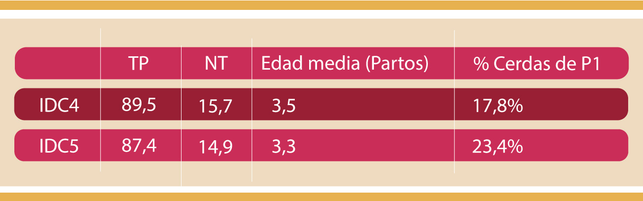 Según el IDC, se observa una notable diferencia en lo que a la prolificidad se refiere, registrándose mejores valores para un IDC de 4 frente al de 5 días. Por otro lado, se observa que hay un mayor porcentaje de cerdas que vienen de su primera lactación, en el IDC de 5 días que en el de 4, ¿algo esperable desde el punto de vista fisiológico?