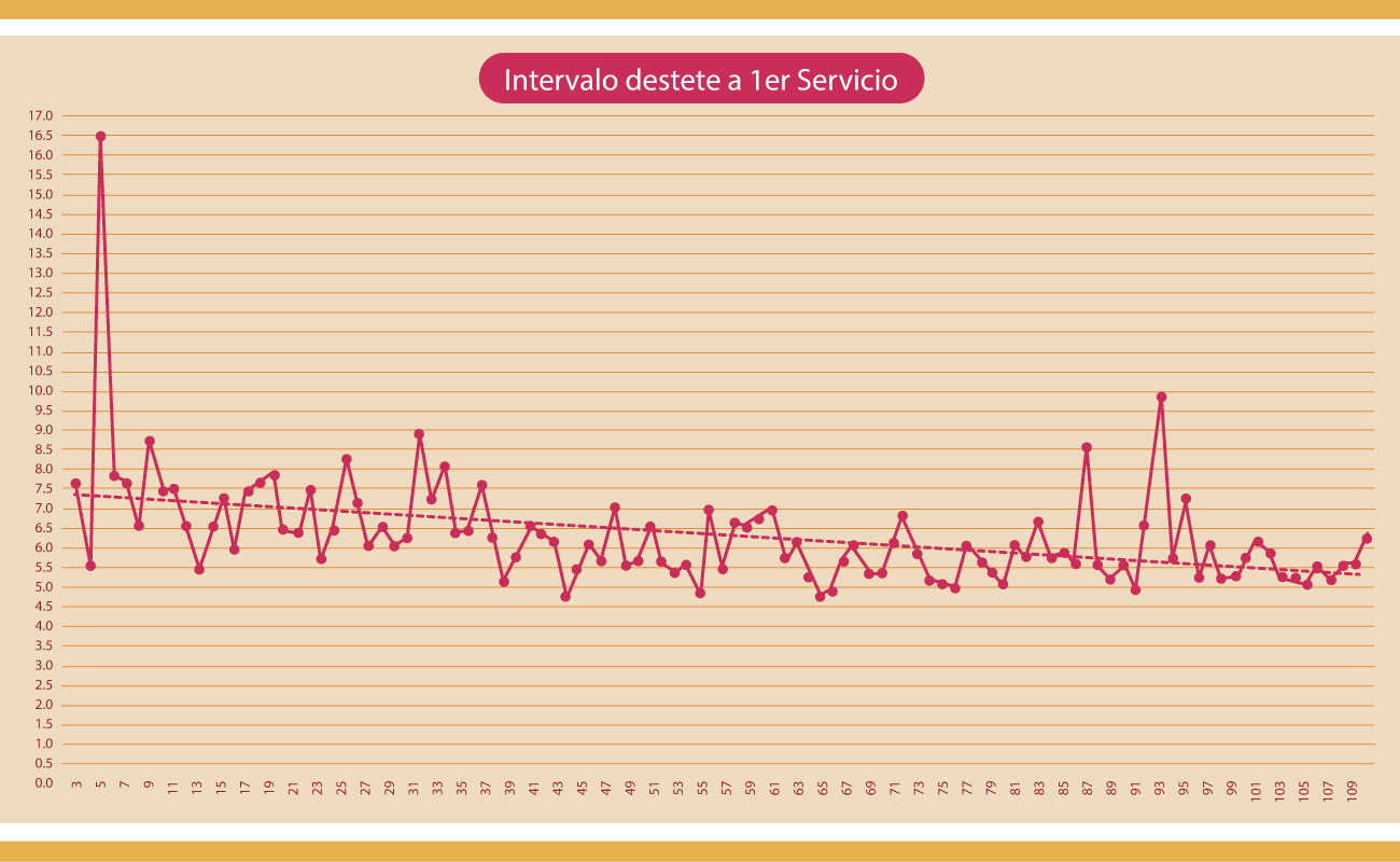 Como se puede ver la línea de tendencia de los Días de destete a 1er. servicio va hacia la baja. La reducción de Días de destete a 1er servicio paso de 7.1 días a 5.6 en promedio de grupos de 26 semanas.