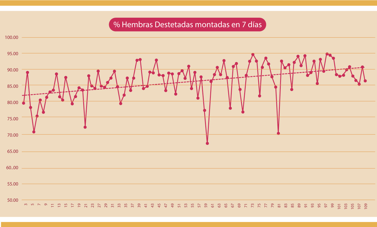 En el caso del % hembras destetadas montadas en 7 días, la línea de tendencia marca un mejora importante.