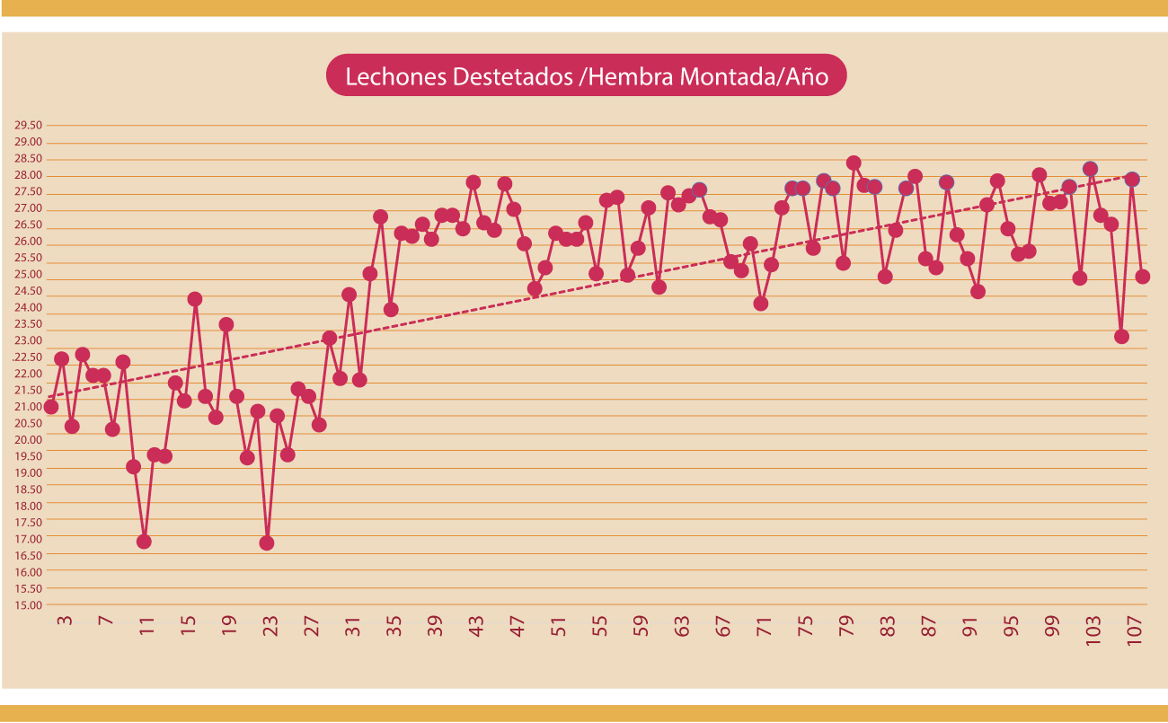 Y en combinación de la mejora de los parámetros antes mencionados se ha logrado una mejora importante en los Destetados/Hembra/Año, que es uno de los parámetros que nosotros podemos controlar.